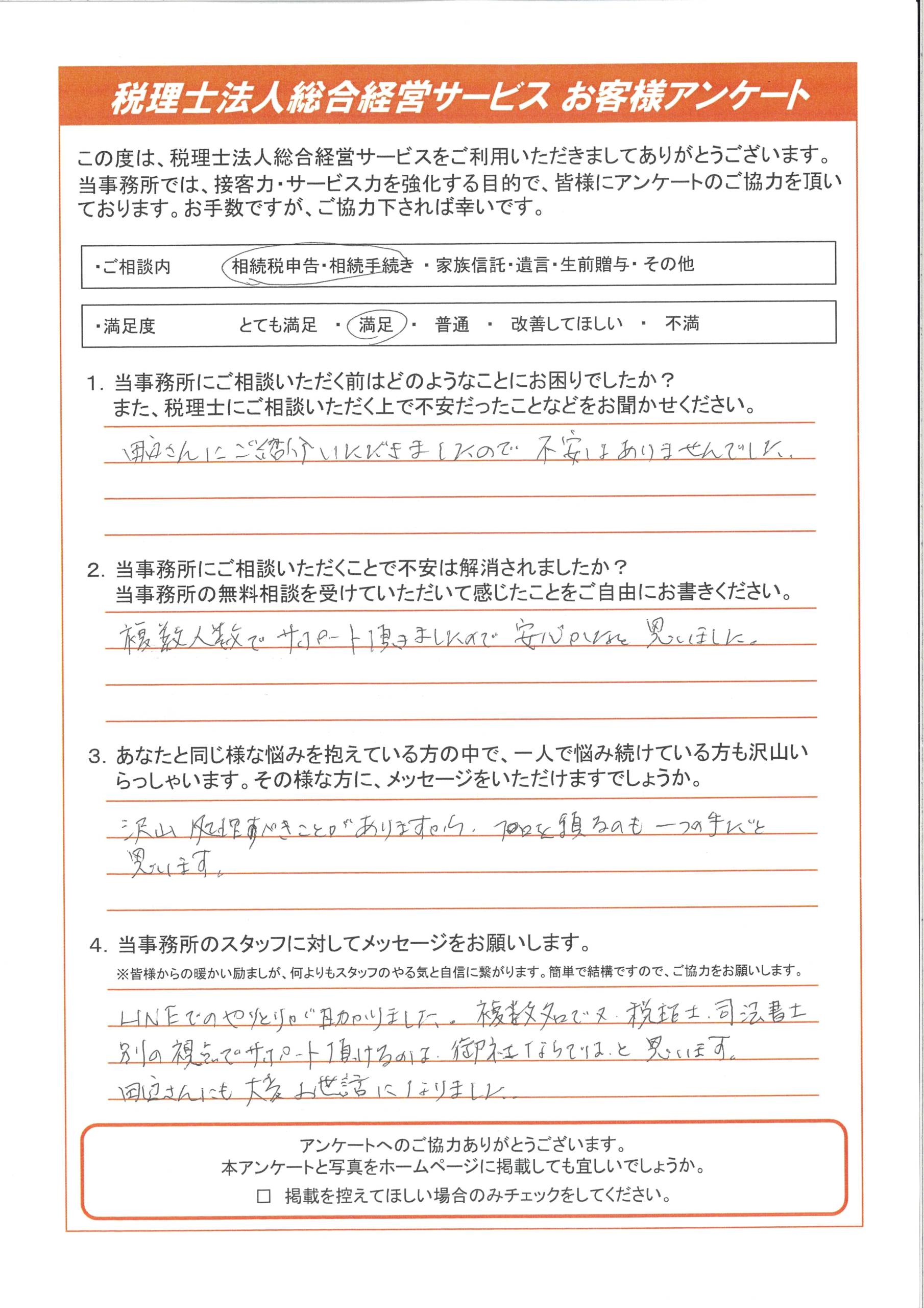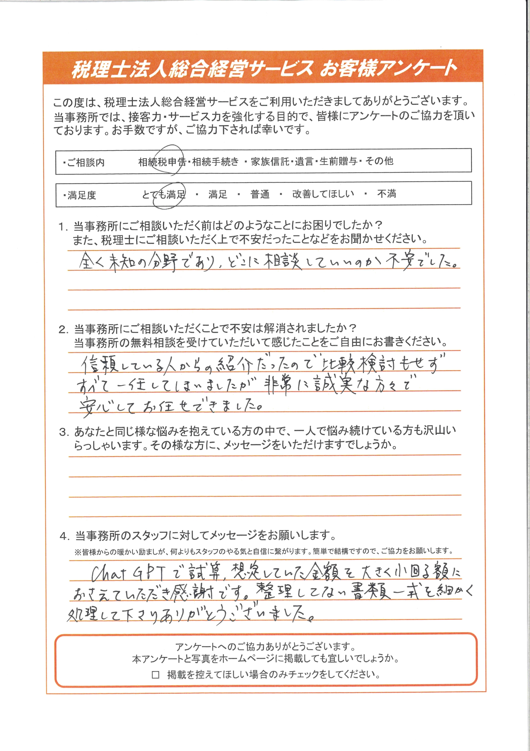 最初のミーティングで不安な気持ちはかなり解消されました。 相続手続き及び相続税申告はプロにお任せすることをお勧めいたします。