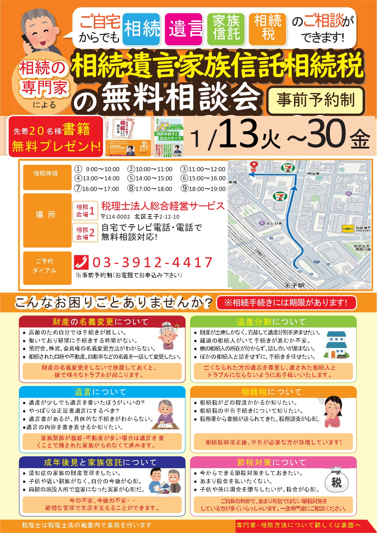 ※画像をクリックして頂くと、拡大版のチラシをご確認頂けます。 無料相続相談会の開催情報 日時 2026年1月13日【火】~1月30日【金】:9:00~19:00 ※内、30分~1時間程度 開催会場 会場:税理士法人総合経 … 続きを読む 相続無料相談会【2026年1月13日~1月30日】